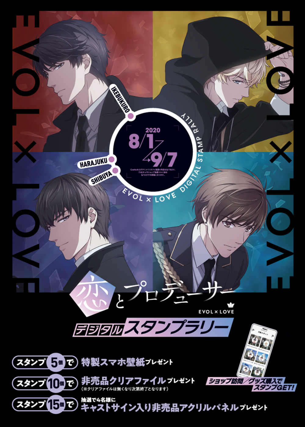 2020.07.16TVアニメ『恋とプロデューサー~EVOL×LOVE~』デジタルスタンプラリー詳細情報解禁!期間中タイアップ店舗では「恋とプロデューサー展」「コラボカフェ」「ポップアップSHOP」「香水投票PROJECT」など一挙開催!